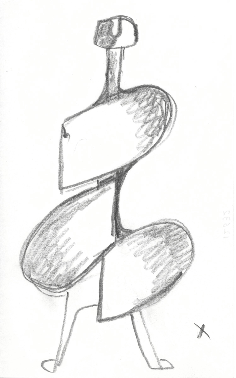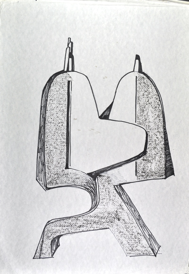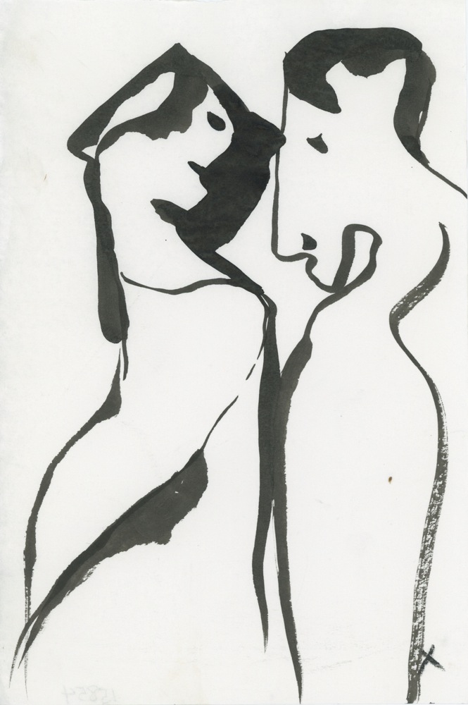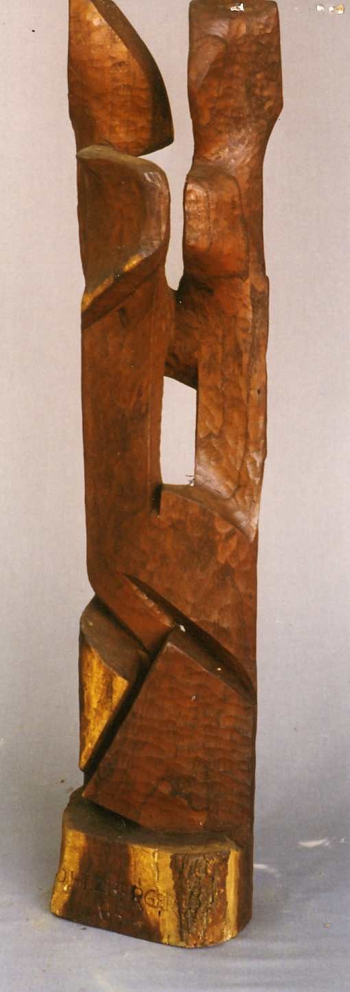 Abstract composition two tall tower like figures with blocky triangular heads face one another and embrace. The back side is cut with a series of angled notches. A tag of bark remains on one corner of the base.