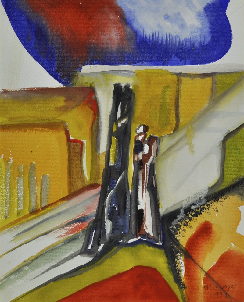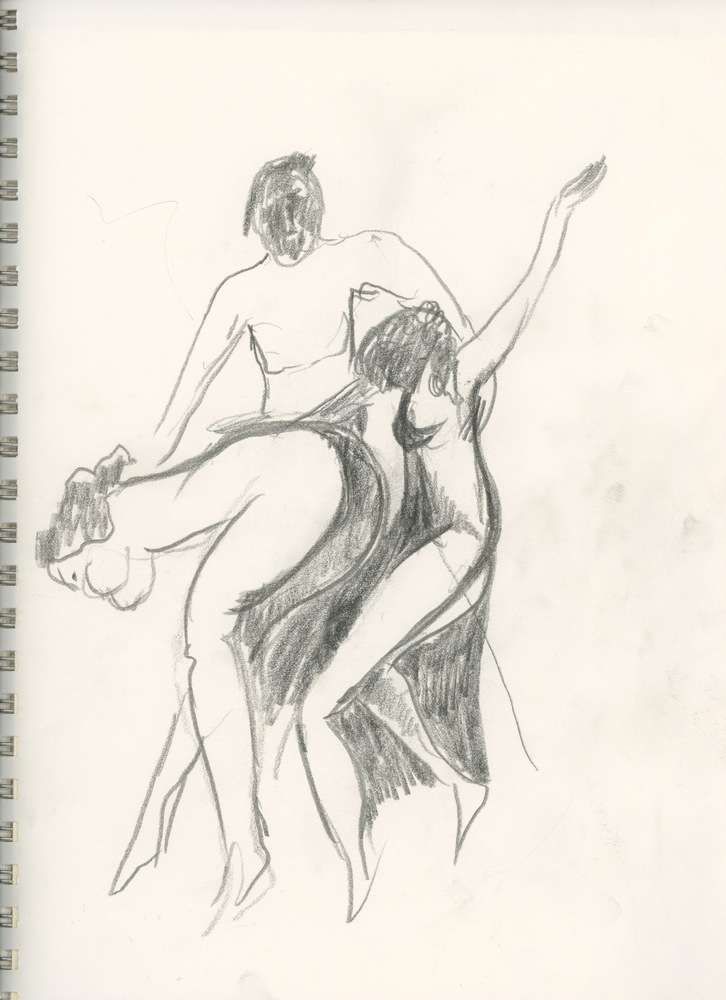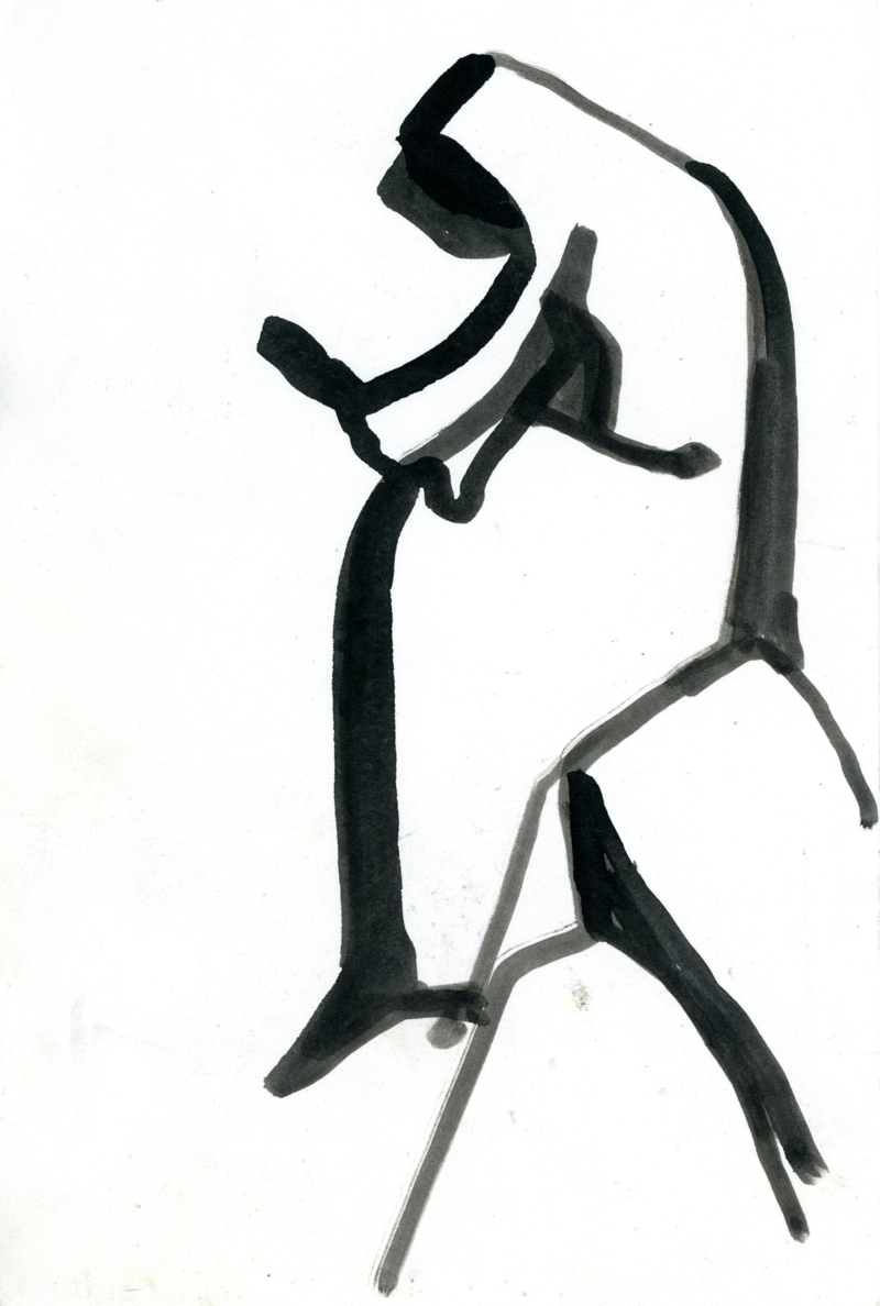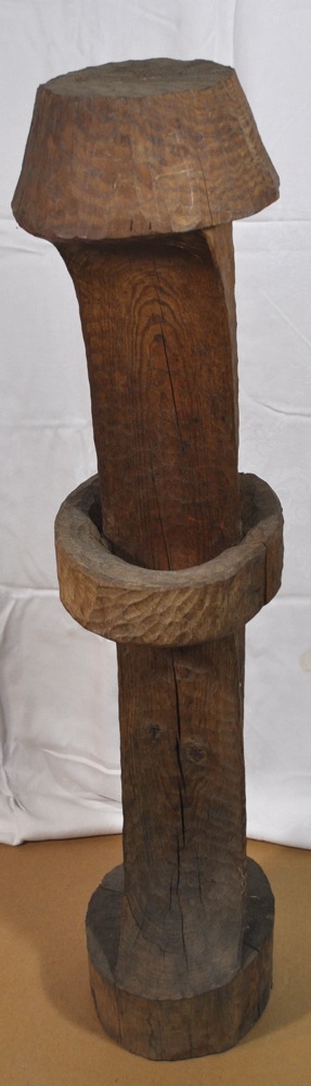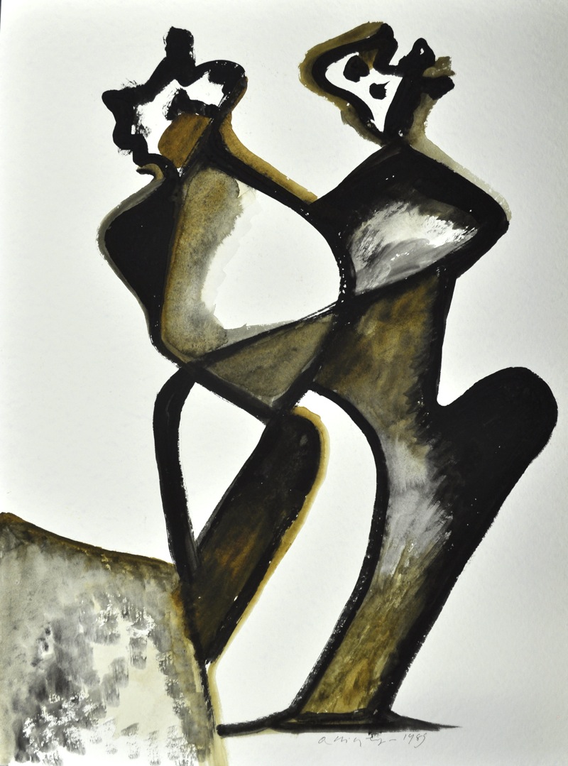 Abstract composition two tall tower like figures with blocky triangular heads face one another and embrace. The back side is cut with a series of angled notches. A tag of bark remains on one corner of the base.