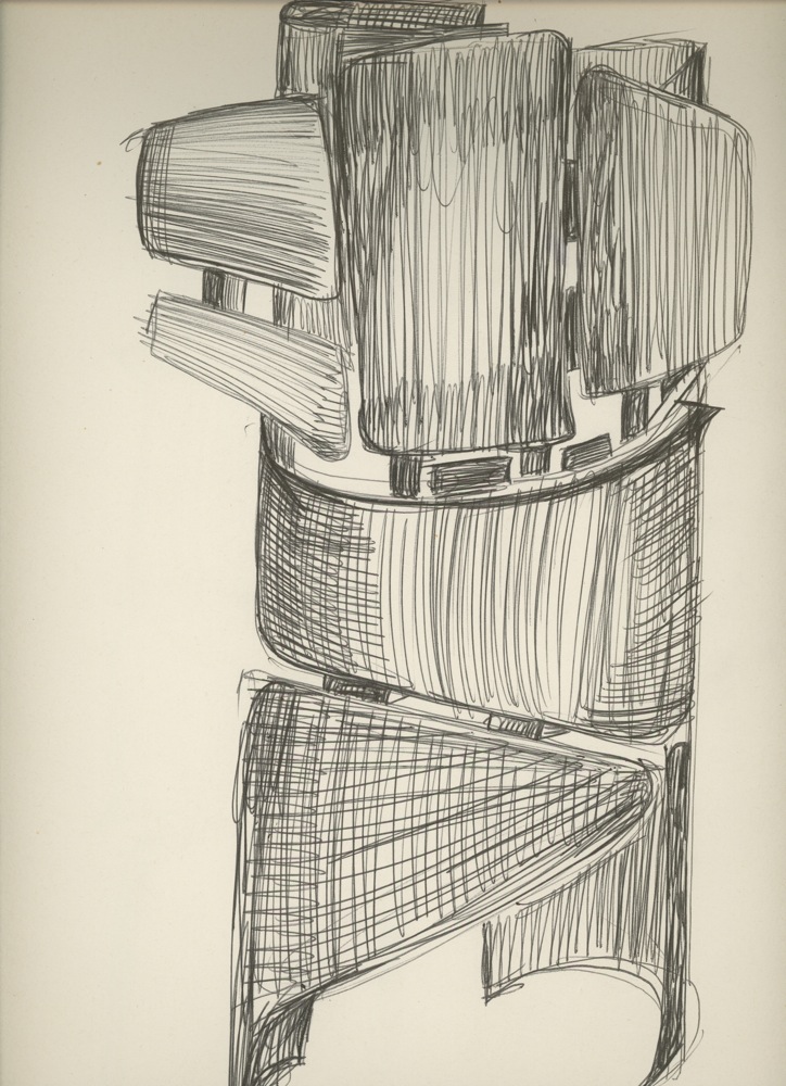 Abstract composition. Simple arcing squared form stands on a disk, hold a ring at center and is capped by a truncated cone.